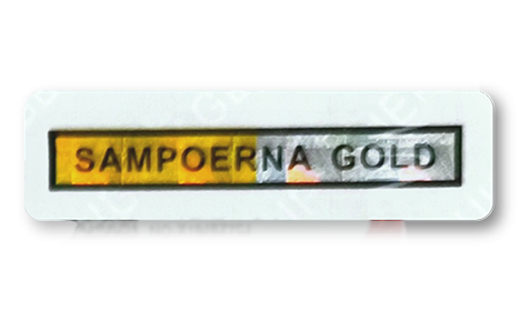 Partial dual hologram pada kemasan Emas WARIS yang asli memiliki garis pengaman di sekeliling bidang holografi.